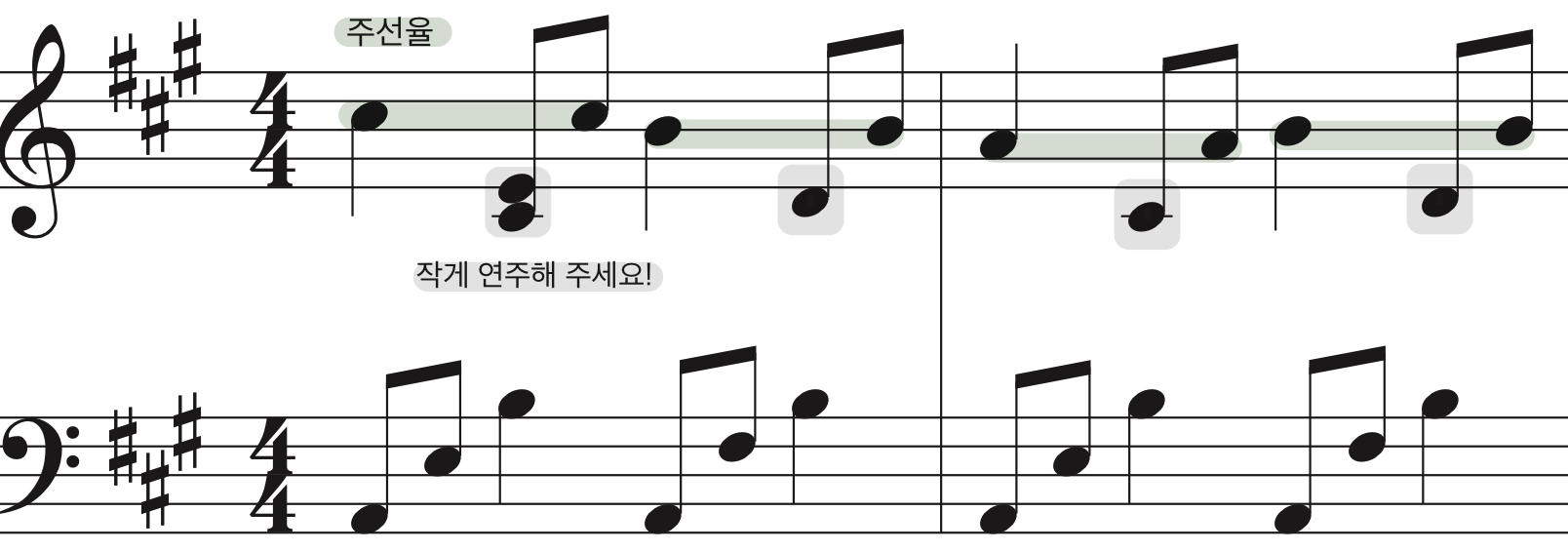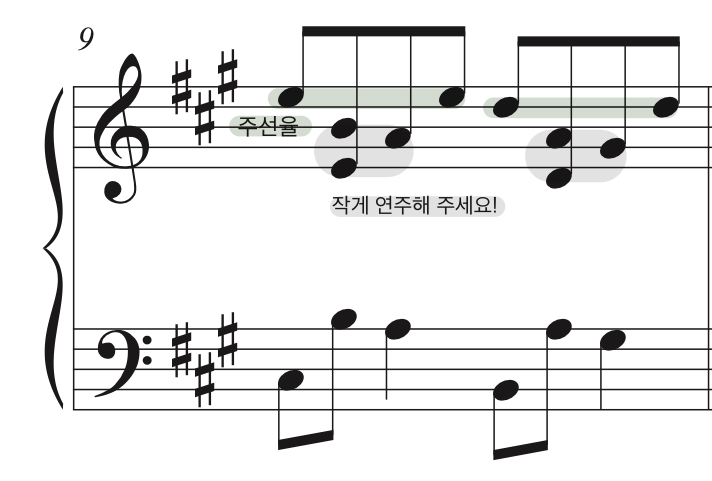 멜로디(초록색)를 선명하게, 나머지 아래음(회색)을 작게 연주해주시면 더 예쁜 소리가 나요 :)