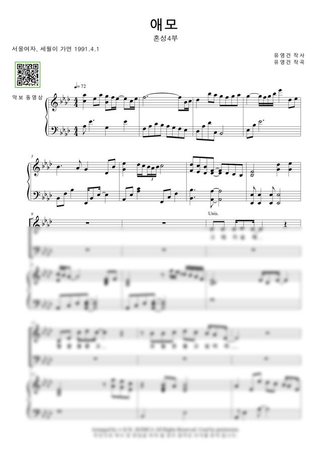부르기 쉬우면서 듣기에는 효과적인 합창악보를 찾고 계신가요? 소알텝에서는 김수희 곡 애모를 추천드립니다. 가수 김수희는 80년대 남행열차로 큰 인기를 얻었고 90년 애모라는 곡을 발표하였고 3년뒤 큰 히트를 치게됩니다. 93년 9월 서태지와 아이들의 '하여가'의 5주연속 골든컵의 기회를 저지시키고 가요톱텐에서 1위를 차지하였으며 결국 5주연속 골든컵을 수상하게 됩니다.