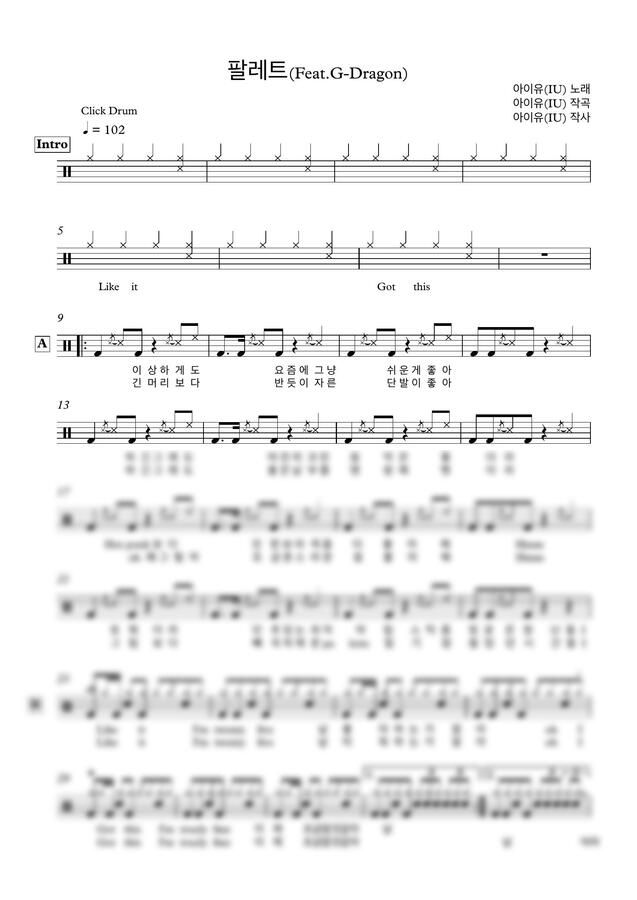 아이유 - 팔레트 (Feat. G-Dragon) (쉬운 드럼 악보,가사포함) by 클릭드럼