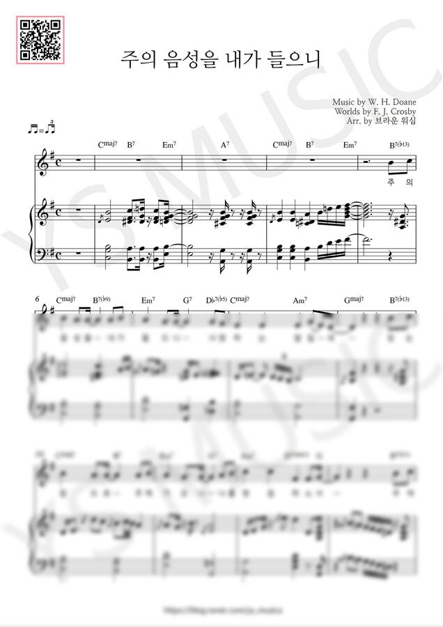 브라운워십 버전의 주의 음성을 내가 들으니 피아노 연주와 악보입니다~