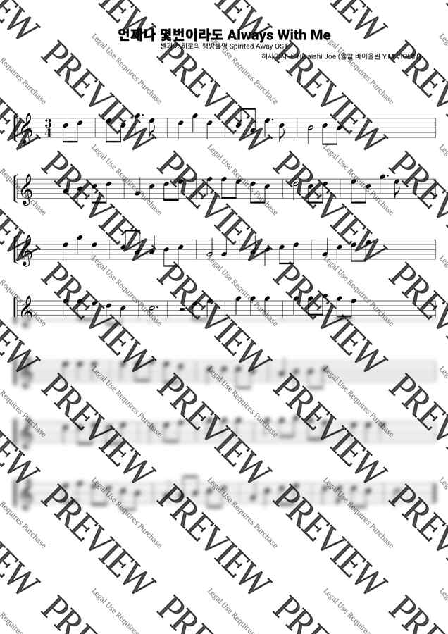 센과 치히로의 행방불명 OST 언제나 몇번이라도 악보를 만들어 봤어요 바이올린 음역대에 맞게 음을 높였구요 좀 더 쉽게 연주할 수 있게 다장조로 만들어 봤어요 가이드 연주 영상도 올려봐요~