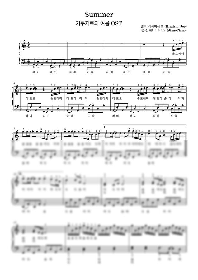 오늘 제가 업로드한 악보는 히사이시조 Summer 다장조 버전입니다.