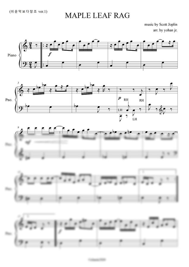 스콧조플린의 maple leaf rag을 쉽게 편곡해보았습니다. 겹음들을 많이 생략하고 다장조로 조옮김하여 원곡보다는 쉽게 칠 수 있을것 같아요. 다른 편곡버전 악보도 있으니 같이 봐주시면 좋을 것 같아요~