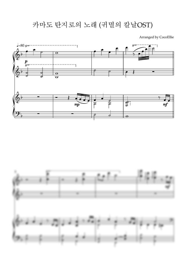 귀멸의 칼날 OST - 竈門炭治郎のうた (탄지로의 노래) (어려운 4 hands 악보) by 코코엘리 1p 미리보기