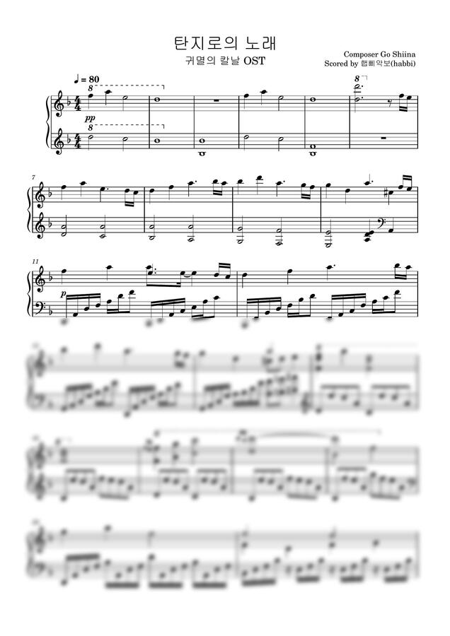 귀멸의 칼날 OST - 竈門炭次郎のうた (탄지로의 노래) (원곡버전) by 햅삐악보(habbi) 1p 미리보기