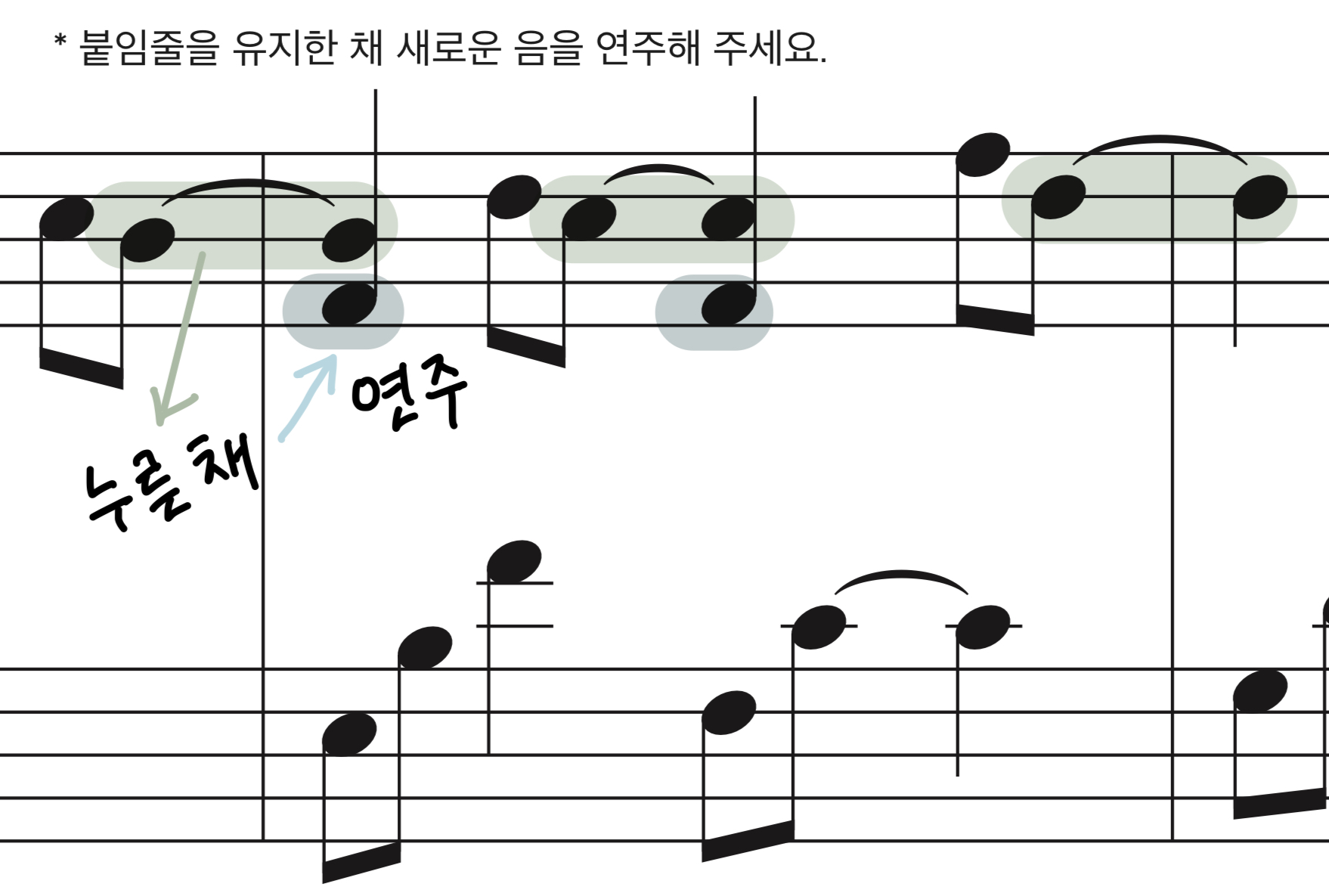 (아래 예시처럼 붙임줄로 연결되어 있는 음을 눌러준 채로 새로운 음을 연주하시면 한결 더 풍성한 소리를 만들 수 있어요.)
